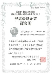 令和7年9月2日付で健康優良企業として「銀の認定」を取得いたしました。